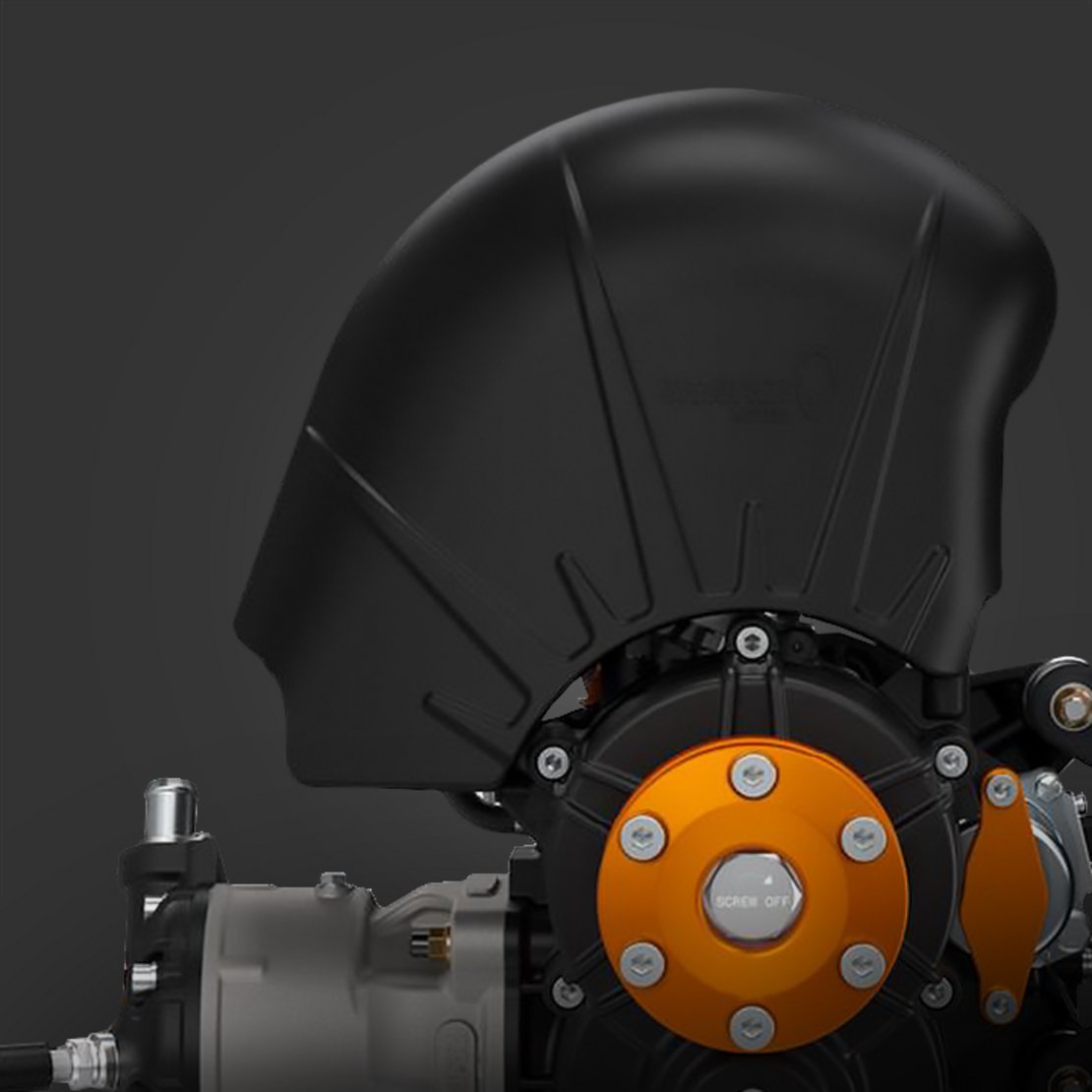 Das flüssiggekühlte Triebwerk ist thermisch äußerst stabil. Der ohnehin effizient laufende 4-Takt Motor verfügt über einen optimal positionierten Wasserkühler. Die Wasserpumpe wird direkt über die Ausgleichswelle angetrieben. Diese effiziente Konstruktionsweise ist Teil des Leichtbaukonzepts dieses Motors.